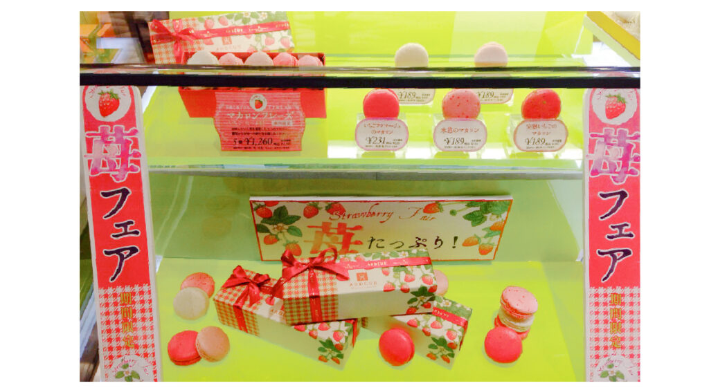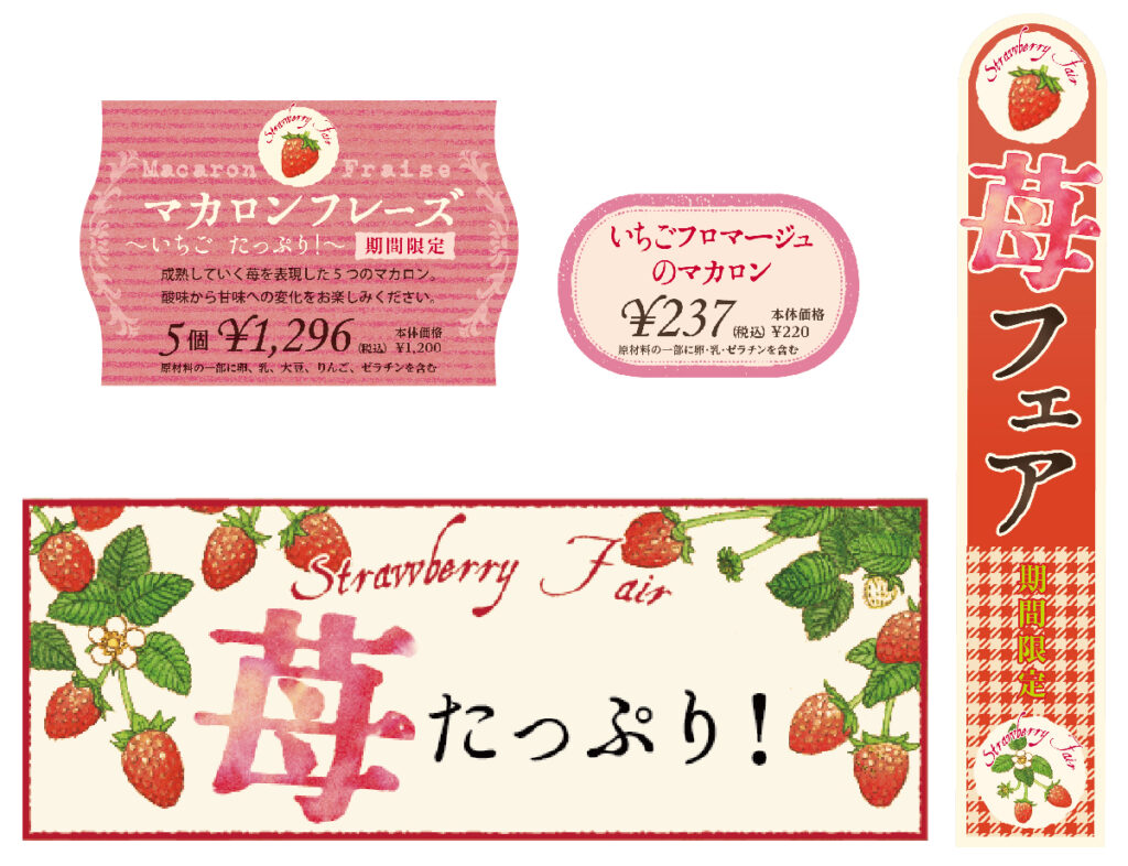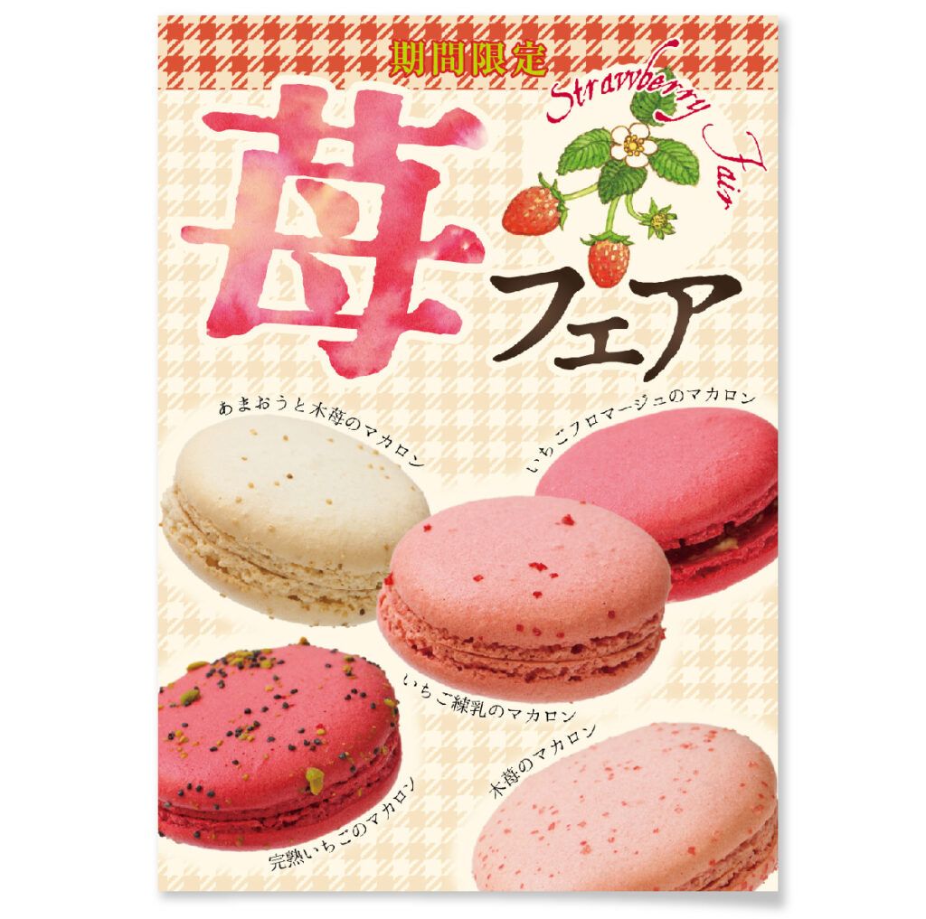 マカロン専門店の苺のフェアを女性をターゲットに可愛らしさを表現しました。その後フェアを行う際の基本のディスプレイの形も提案し、POPを作成しました。