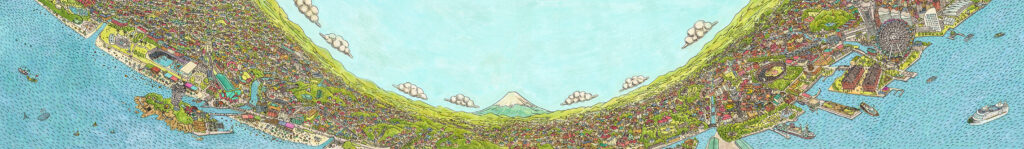 藤沢と横浜の街並みを繋げた一つの風景として描きました。いつも駅を利用する人が何度見ても新しい発見があるような絵になるよう心がけました。