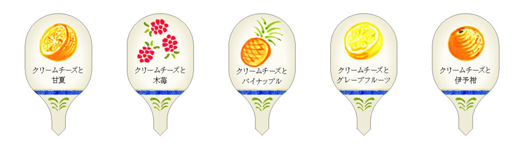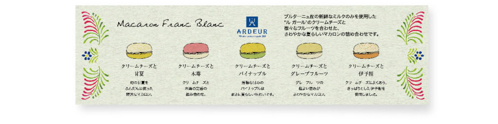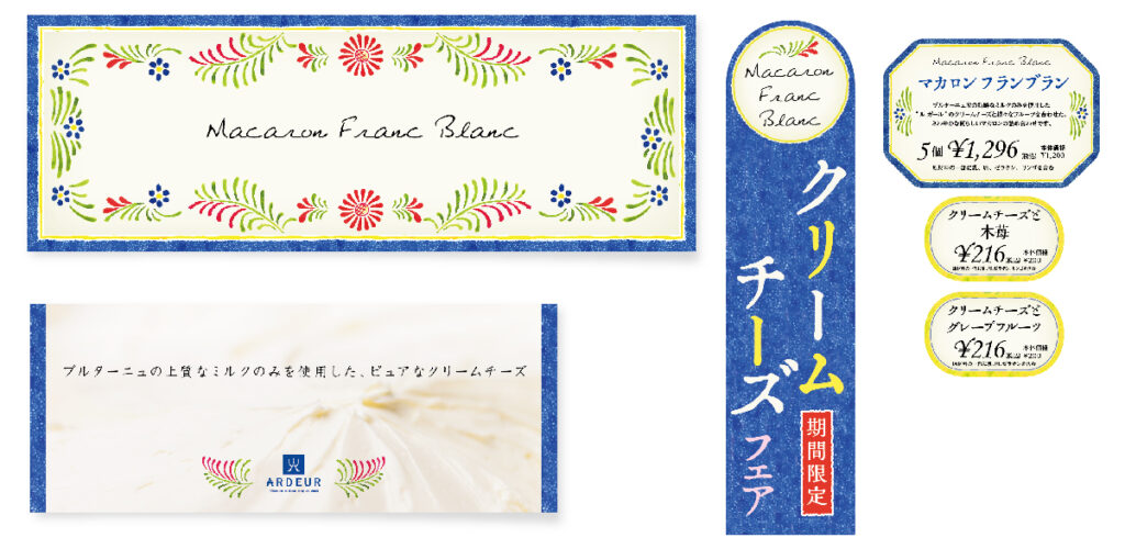 マカロン専門店のクリームチーズフェアのパッケージデザイン、販促物のデザインを担当しました。