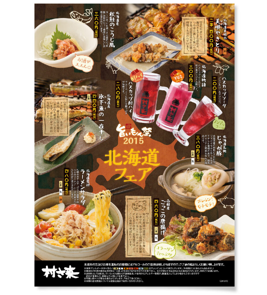 居酒屋チェーン「村さ来」様の北海道フェアメニューのデザインを担当しました。