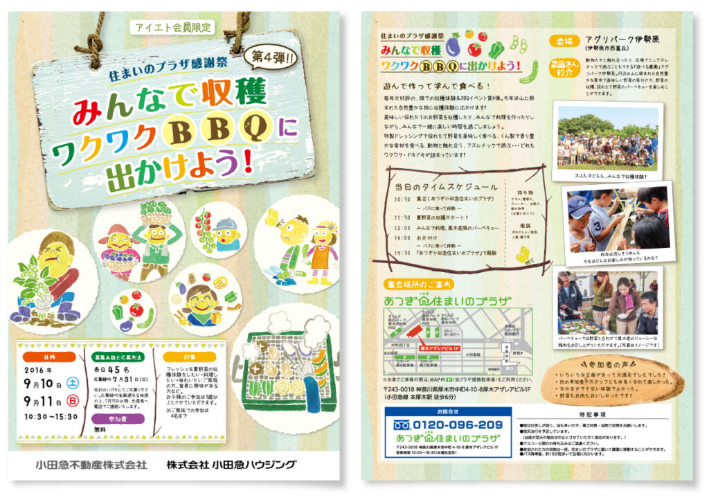 親子で参加する収穫体験やBBQなどのイベントのパンフレットデザインを担当。楽しい雰囲気が出るように心がけました。