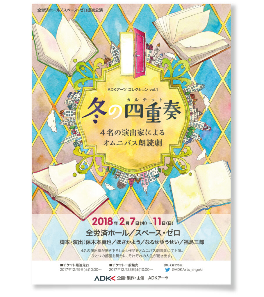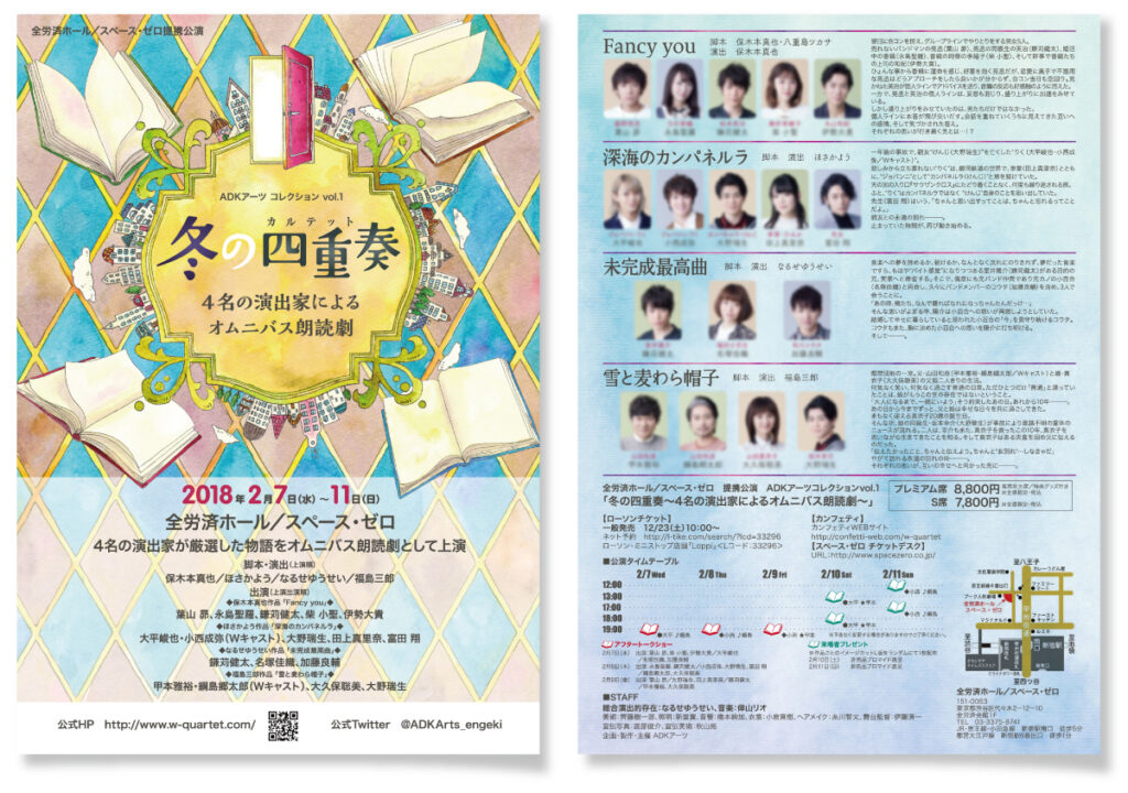 4組の演出・脚本家による4本仕立ての朗読劇「冬の四重奏」のメインビジュアル(イラスト・ロゴ)から告知広告、演劇パンフレット、ノベルティなどのデザインまで担当させていただきました。