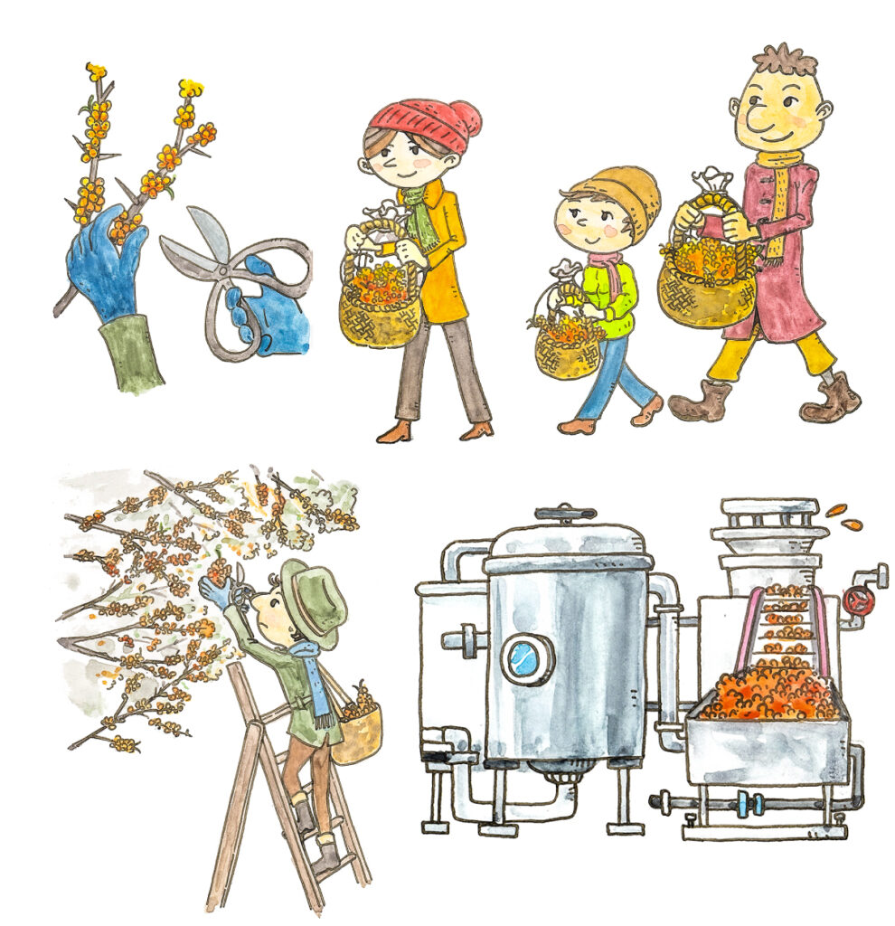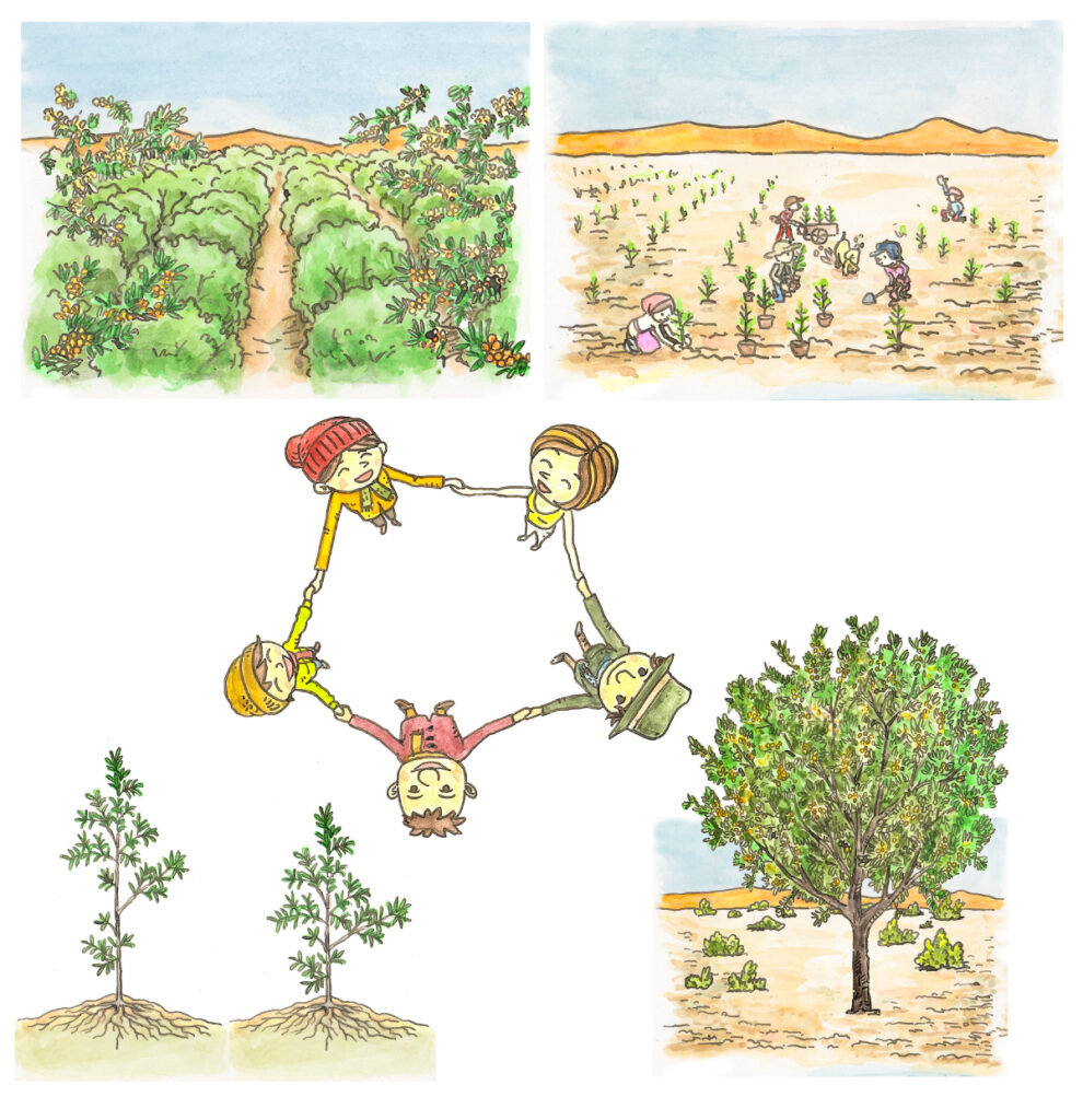 内モンゴルでのサジーの植林による砂漠化の防止や、現地の経済効果などをイラストにしました。