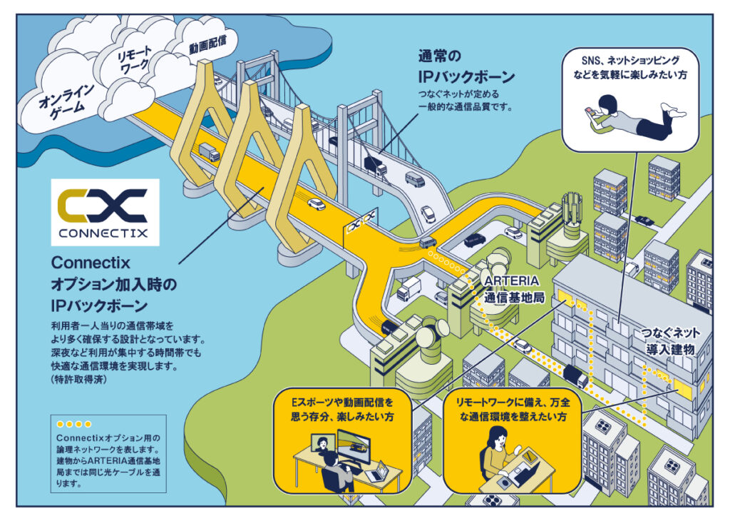 つなぐネットミュニケーションズ様のネット通信の通常のサービスとオプション加入時の回線の流れの違いを交通にたとえたイラストを制作しました。
