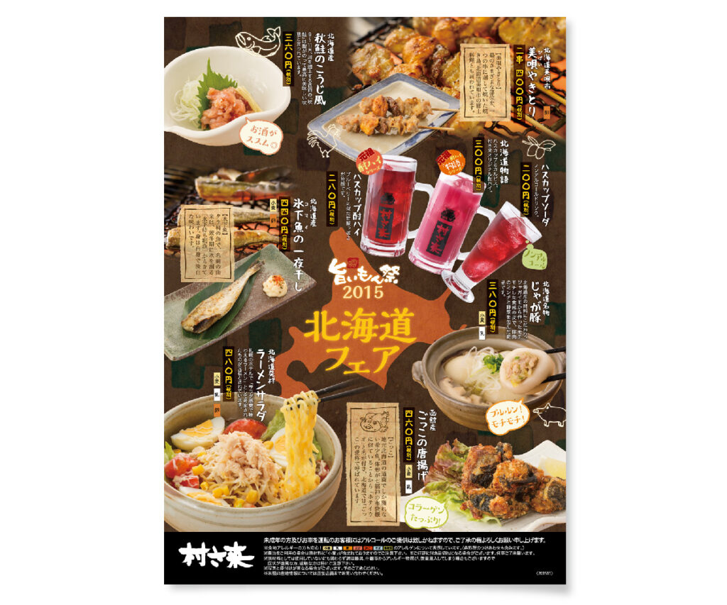 (担当業務:メニューデザイン) 居酒屋チェーン「村さ来」様の北海道フェアメニューのデザインを担当しました。